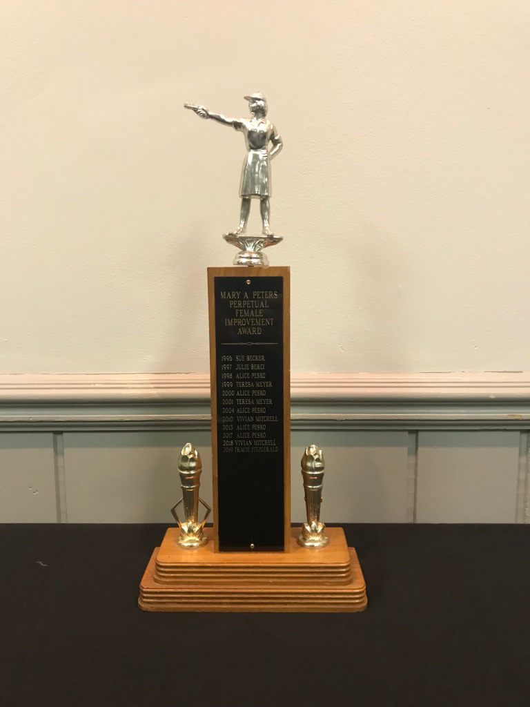 To qualify for this award, the female shooter must have fired in 75% or more matches during a 2 year period with at least a 10% increase in score during the second year. This trophy, first dedicated in 1970, has not been awarded every year due to a lack of female shooters.