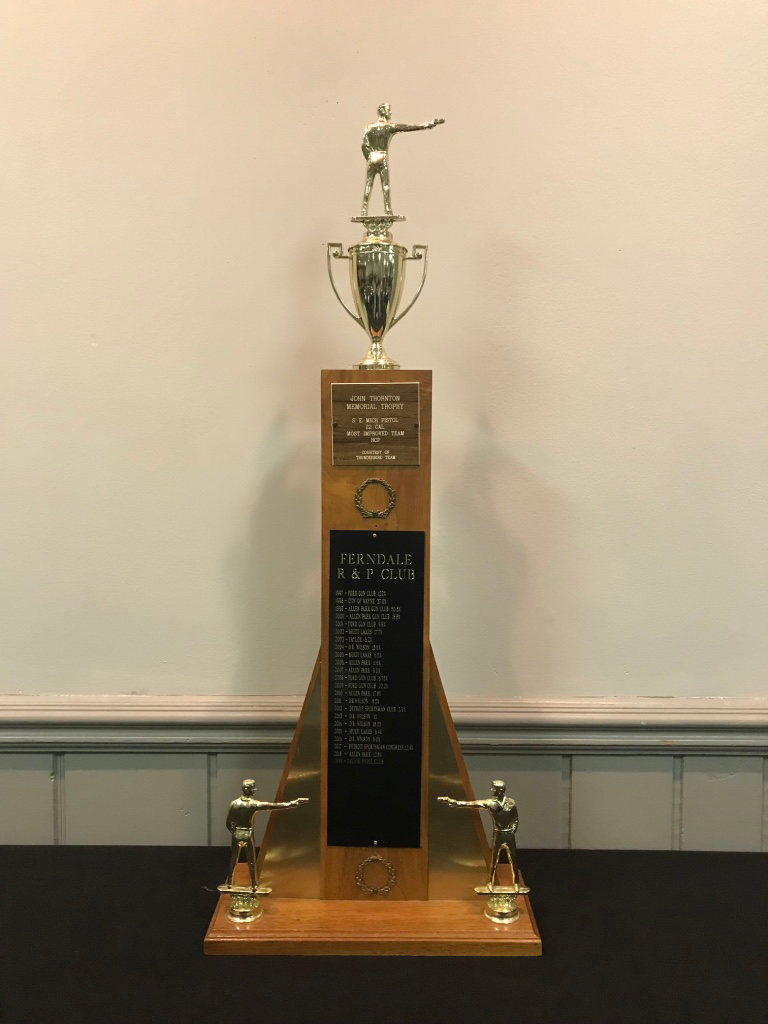 Awarded to the SEMPA .22 Caliber Most Improved Handicap Team. Who is John Thorton? Anyone remember? This trophy was dedicated by the Thunderbird Gun Club and rededicated by the Ferndale Rifle and Pistol Club. This award was first established in 1969, 12 years after the Southeastern Michigan Pistol League organized.